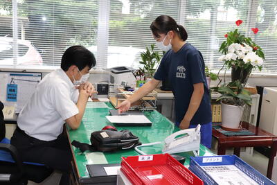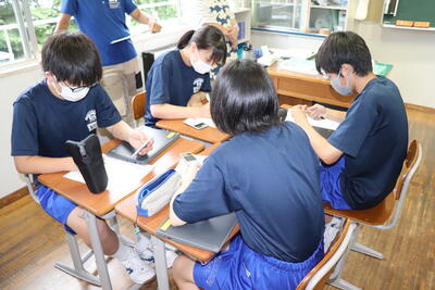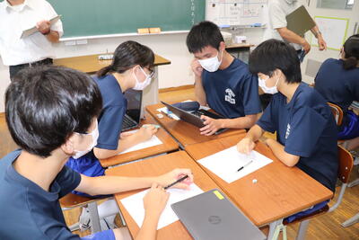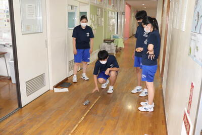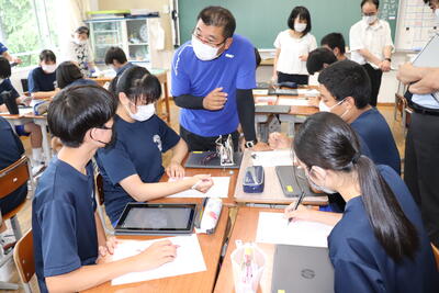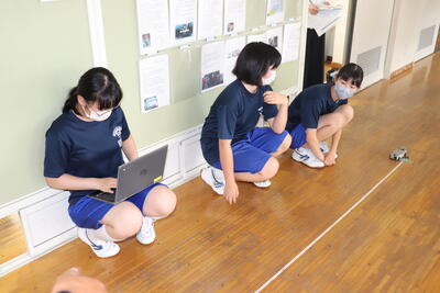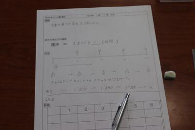 2022年7月14日 16時40分本日は、第3回校内授業研究会でした。3年生の理科の「物体の運動の速さを求める」授業でした。廊下で台車(小型の車)を走らせ、ストップウォッチやタブレットの動画機能を使って速さを測るなど、生徒がそれぞれの方法で速さを測る方法を考えていました。全員がいきいきと学習活動に取り組む姿に、理科の楽しさを実感しました。