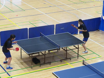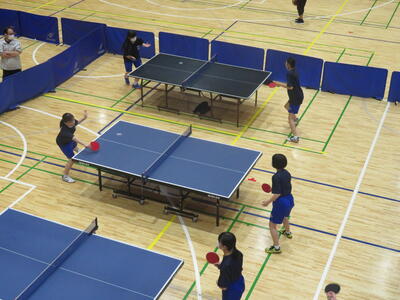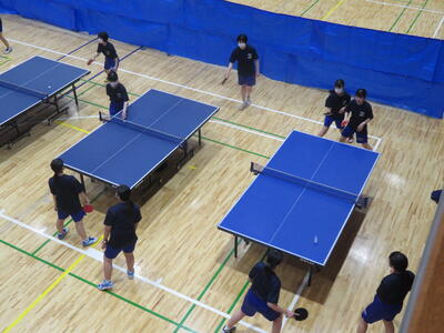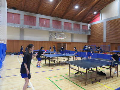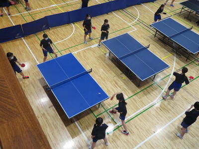 2022年5月23日 19時20分卓球部は男女合わせて、体育館の4分の1コートで練習しています。そこをさらに男女で分けるのでそれぞれ8分の1コートで、卓球台4面使っています。