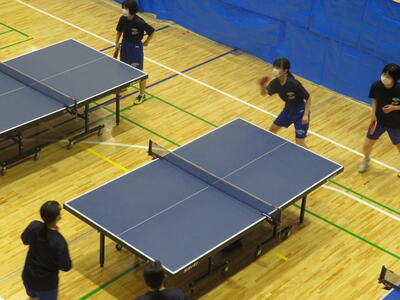 2022年5月23日 19時30分男子も女子と同じように8分の1コートで、卓球台4台を使い練習しています。次々と出されるボールを的確に打ち返していきます。集中して練習に取り組んでいました。