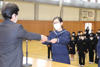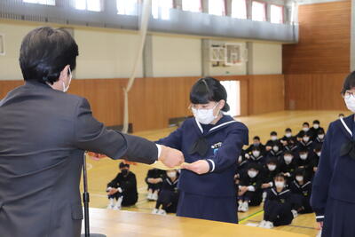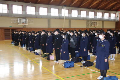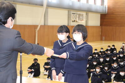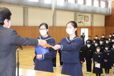 2022年3月23日 11時58分修了式を終えて、令和3年度が無事終了しました。修了証書の授与や代表生徒の作文発表など、最後を締めくくるのにふさわしい式となりました。4月から1年生は2年生へ、2年生は3年生へ進級します。今日の様子から安心してやっていけそうです。しっかり三中を引っ張っていってください。さて、本日、通信票を配付しました。ぜひご確認いただき、新年度に向けてのアドバイスをお願いします。この春休みを有意義に過ごし、4月6日は元気に登校してほしいと思います。