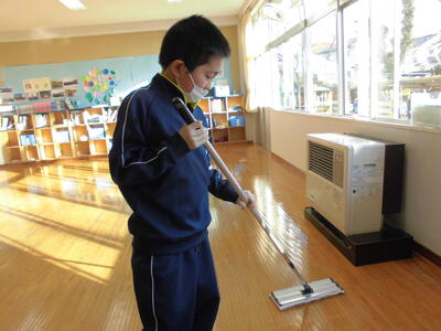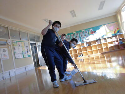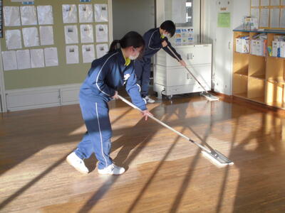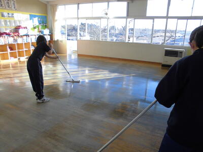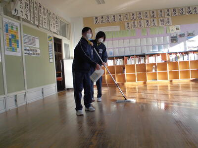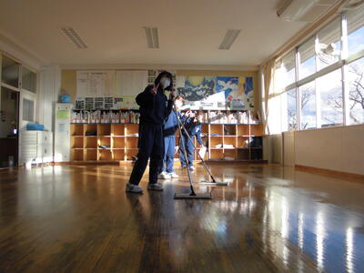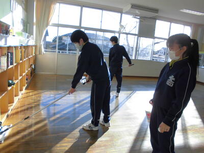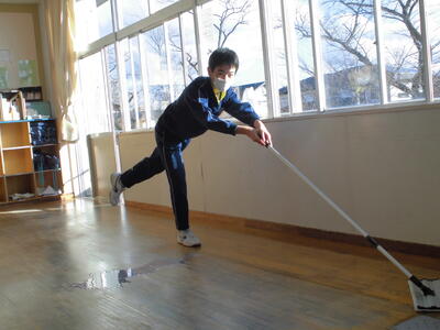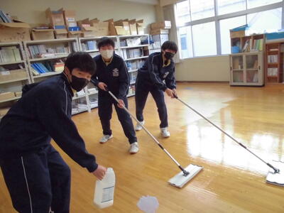 2022年2月18日 17時46分教室のワックスがけを行いました。整美委員会主催です。みんな一生懸命手際よく作業していました。しかも二度塗りです。すばらしい!!
