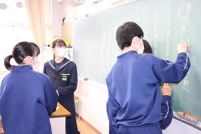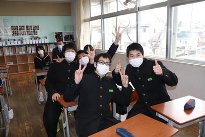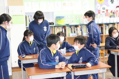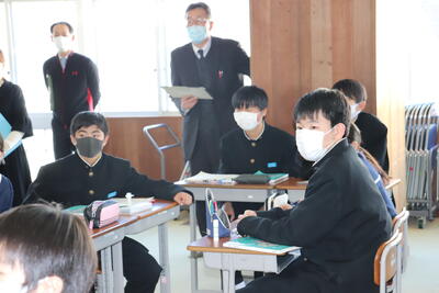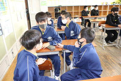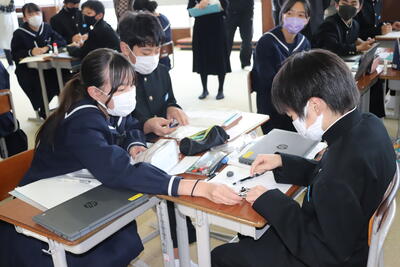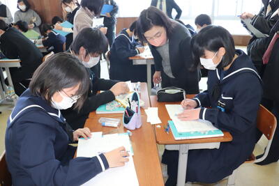 2022年1月25日 07時08分校内授業研究会を行いました。1年1組数学の授業です。コンパスを使い指定された角度を作図していました。二等分線をどう引くのか、悪戦苦闘しながらも、友だちに教えてもらいながら頑張っていました。みんなとても楽しそうでした。