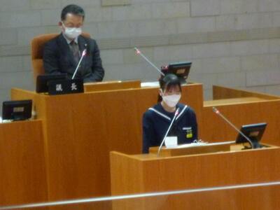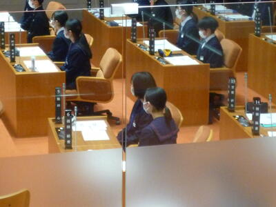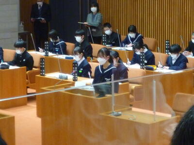 2022年1月26日 19時13分須賀川市役所議場において、「中学生による模擬議会」が開催されました。本校から生徒会役員の西澤里沙さん、関根かれんさん、釋 理恵さんが参加しました。三中からは西澤さんが、牡丹園周辺施設の整備に関する質問をしました。堂々と発言でき、とてもすばらしい模擬議会となりました。3名のみなさん、お疲れさまでした。