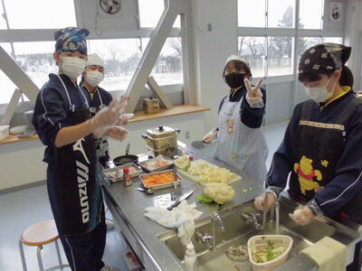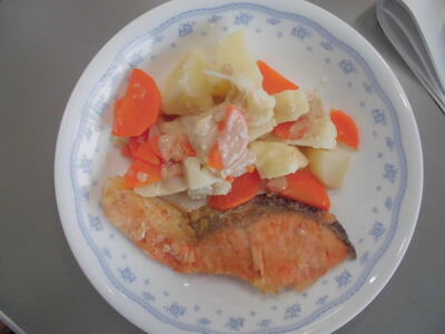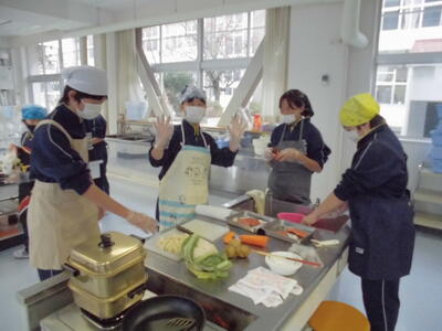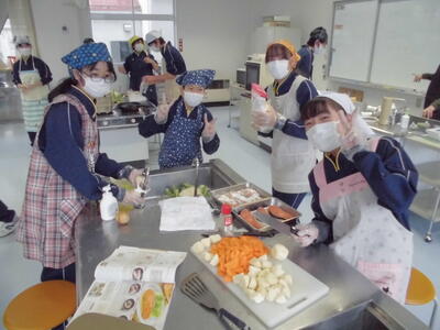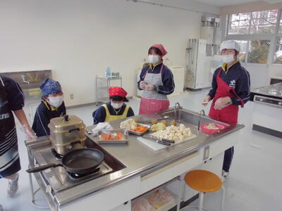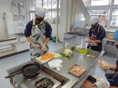 2021年12月8日 15時20分今日は1年1組の調理実習です。前回と同じ「鮭のムニエル」と「温野菜サラダ」です。今回は試食させていただきました。おいしかったです。ご飯がススムくんでした。ごちそうさまでした。