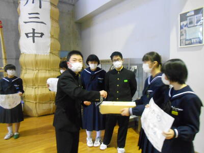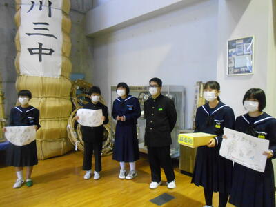 2021年12月10日 10時48分本日から16日まで赤い羽根募金を実施しています。JRC委員会の皆さんが、朝から募金活動を行っています。生徒の皆さんに赤い羽根が配付されました。保護者の皆さんも含めて、募金のご協力をお願いします。