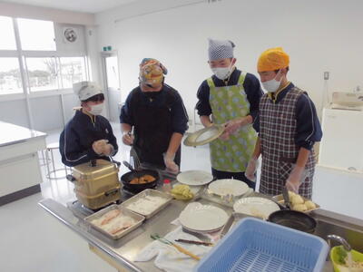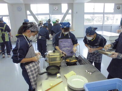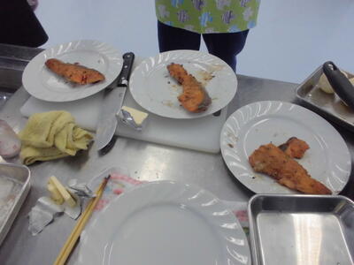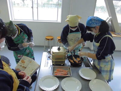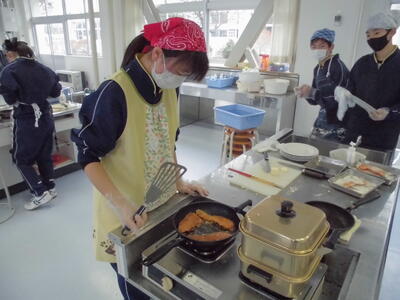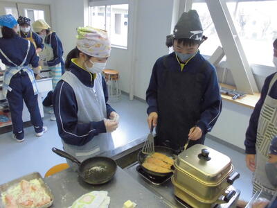 2021年12月7日 11時41分1年3組の家庭科の授業です。いい匂いが漂っています。そっと覗いてみると、な、な、なんと、巨大な鮭の切り身をおいしそうに調理していました。鮭のムニエルです。おいしそう。でもなぜかなつかしい・・・。昔作ったよなあ~。給食の時間が楽しみですね。残さず食べてね。ちなみに試食はいつでもウェルカムですよ。