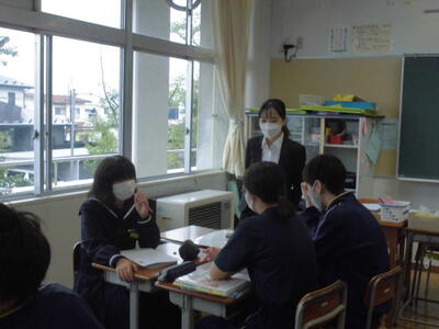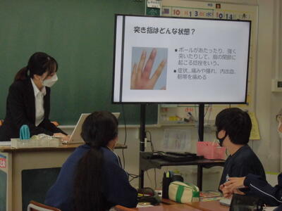2021年10月13日 18時14分教育実習生の緑川みなみ先生が、保健体育において「応急手当の意義と実際」についての授業を行いました。2年3組のみなさんが、「RICE」処置について熱心に話を聞いていました。緑川先生、実習お疲れさまです。