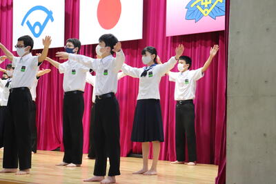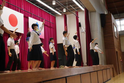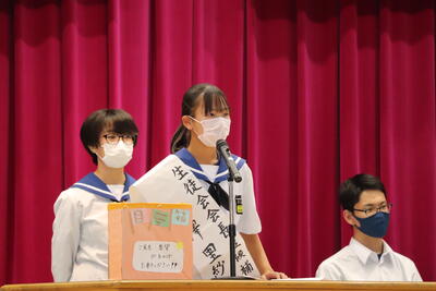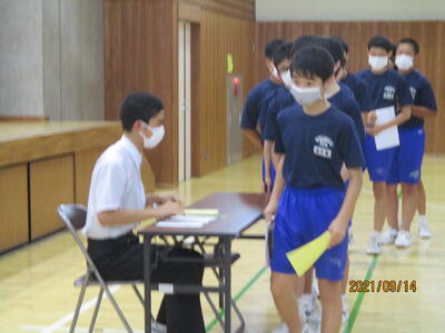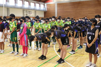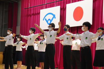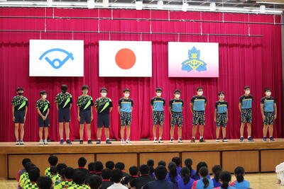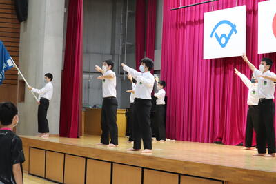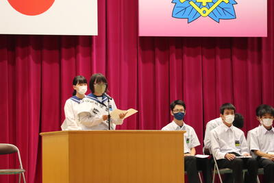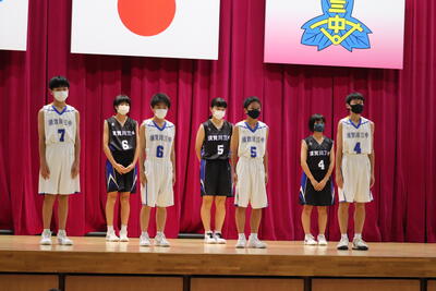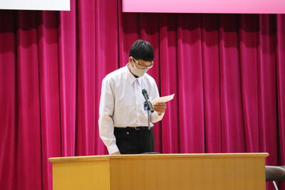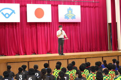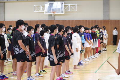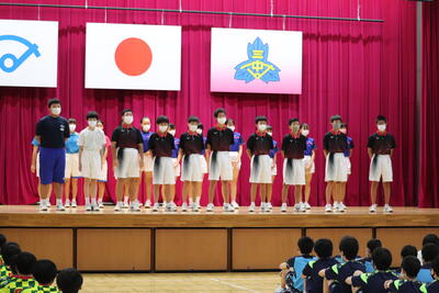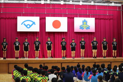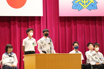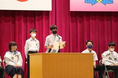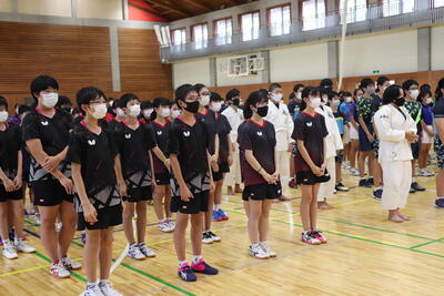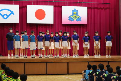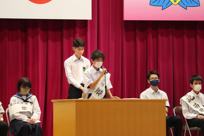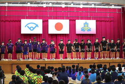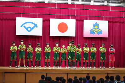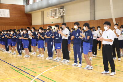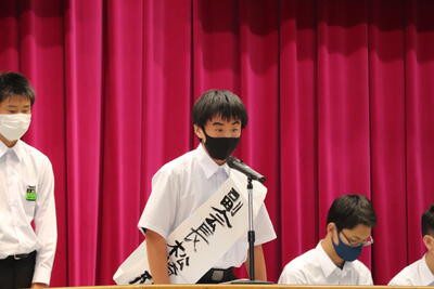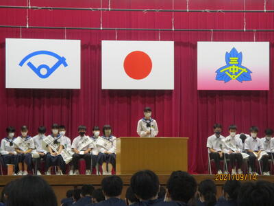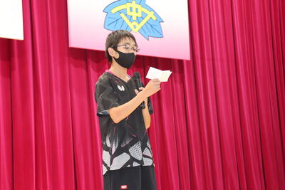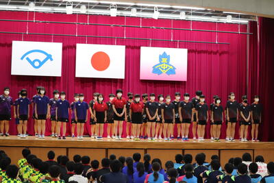 2021年9月22日 07時24分支部新人戦に向けて選手壮行会が盛大に開催されました。今回は、サプライズ企画で3年生のエール付きです。選手代表お礼の言葉で卓球部の星 湊音くんが、「先輩に認めてもらえるような試合を目指します」と言っていたように、ぜひ先輩を超える最高のプレーを期待しています。頑張ってください!