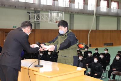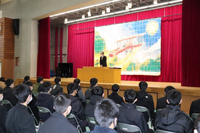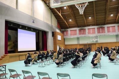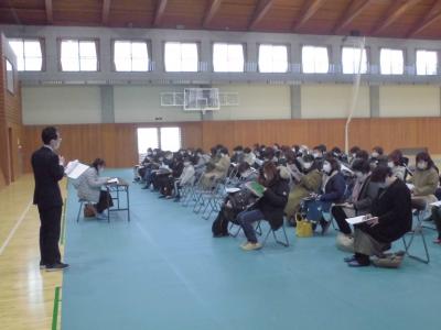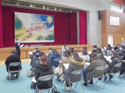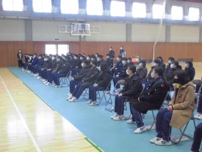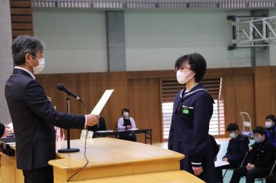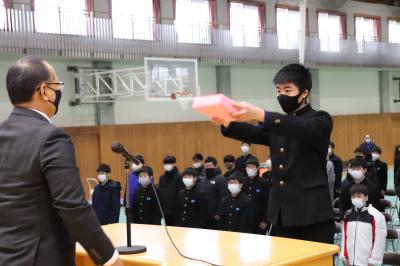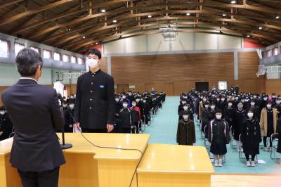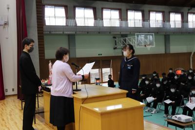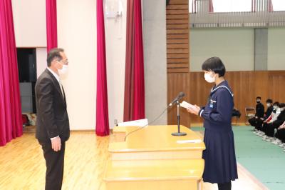 2021年2月28日 14時01分同窓会入会式です。同窓会長さんより入会を認められ、激励の言葉をいただきました。また、記念品が贈呈され、佐藤七海さんが代表として、誓いの言葉を述べました。きっと末永く同窓生として三中を支えてくれることと思います。3年生の皆さんは、三中のOB・OGとして益々活躍が期待されます。頑張ってください。