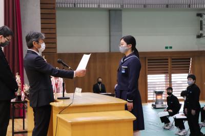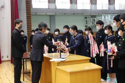 恒例のトロフィー返還です。 | 体育文化功労賞の表彰 代表の角田莉緒さんです。 | 生徒会功労賞の表彰 代表の戸梶璃音さんです。 |