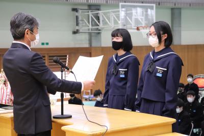 | 読書賞の表彰 代表の今野咲幸さんです。 | 学習コンテストグランプリの表彰 3年間計9回全て満点だった滝浦美雨さんと角田莉緒さんです。 |