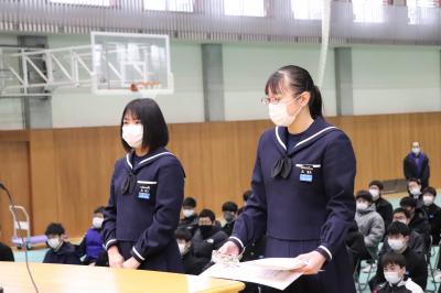 2021年2月28日 14時08分三中恒例の活躍をたたえる会が行われました。体育文化功労賞や生徒会功労賞、皆勤賞、精勤賞、読書賞、学習コンテストグランプリの表彰、記念品贈呈、そしてスライドショーの上映です。たくさんの3年生が表彰を受けました。新型コロナで多くの制限を受けながらも大いに活躍してくれました。皆さんの活躍している姿は、後輩たちの目にきっと焼き付いていることと思います。これまで本当にお疲れ様でした。受賞された皆さん、おめでとうございます。