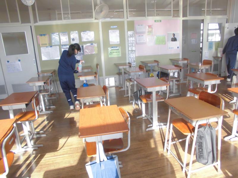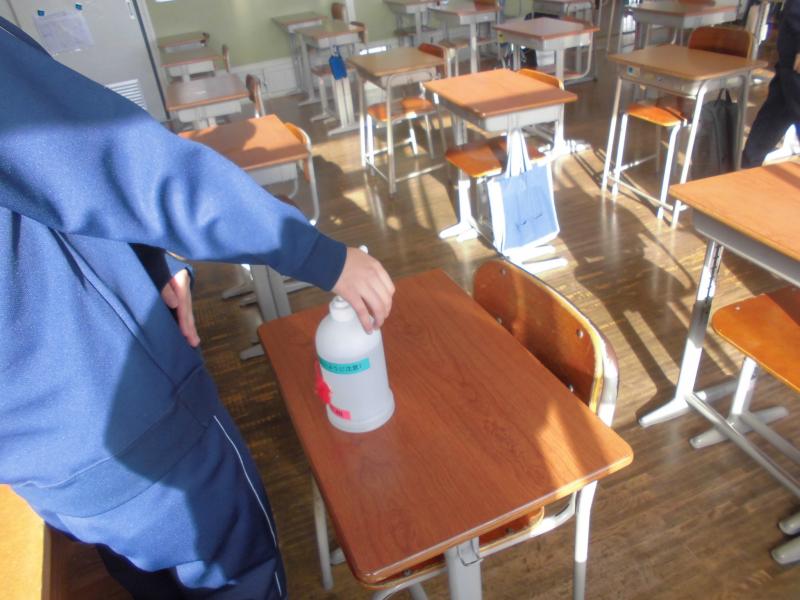 そして、給食前や掃除の後には一人一人の机を消毒しています。給食については、全員前を向いて会話をせずに食べています。一日も早く、楽しく会話しながら給食を食べることができる日が来ることを願うばかりです。