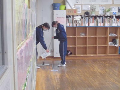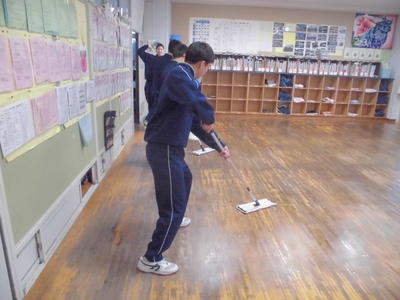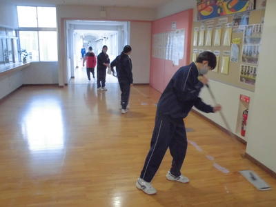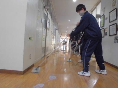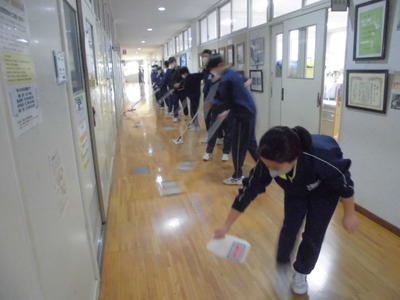 2020年12月24日 17時29分昨日は、ワックス清掃第二弾でした。教室も大変ですが、廊下は人通りもあるので大変です。整美委員のみなさんが、菊地先生の後に続いて、一斉に塗っていました。端から見ていると、「これは、何らかの作戦なのか!」と思えるような、まるでフォーメーションでした。