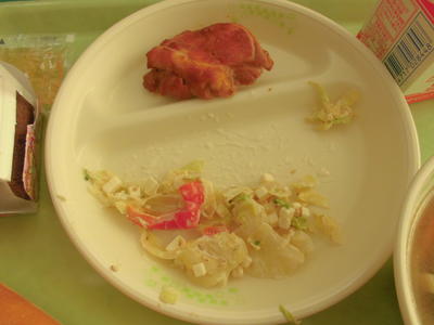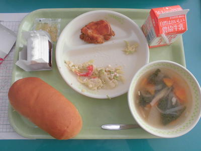 2020年12月24日 17時14分今年最後の給食は、「クリスマス献立」で~す。きっとみんな楽しみにしていたことでしょう。おなじみのタンドリーチキン。カレー風味で肉は軟らか、とにかく「うまい!!!」の一言です。もみの木サラダは、チースやブロッコリーがクリスマスツリーなんですね。混ざっちゃったからよくわからなくなっちゃいました。でも、おいしかったです。コンソメスープは、具だくさんで、旨みたっぷりこれも最高でした。そしてお楽しみのプチケーキ。プチとはいいながら、なかなかのサイズです。生クリームが・・・・・し・あ・わ・せ♡今日はクリスマス・イブですね。でも、明日は学校。ガーン。ごちそうさまでした。