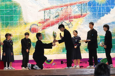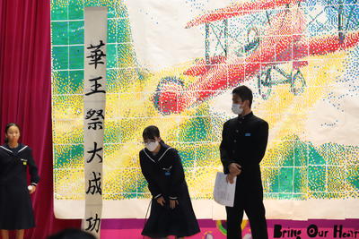 2020年11月6日 15時20分いよいよ華王祭特集もラストとなりました。エンディングセレモニーは、表彰式と生徒会主催の劇、そしてスライドショー、生徒会役員引き継ぎ式、そしてテーマソングを歌ってからのくす玉割り、閉祭宣言で幕を閉じました。とにかく盛り上がった華王祭でした。コロナに負けず、みんなよく頑張りました。来年も楽しみにしています。