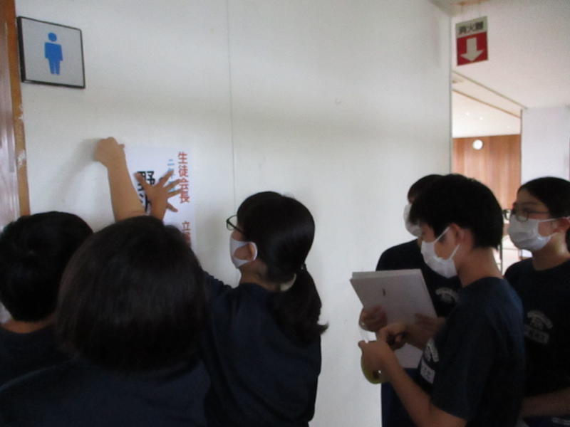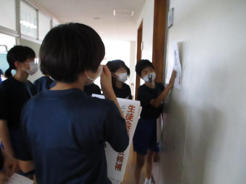 2020年9月7日 14時22分来週の生徒会役員選挙に向けて、選挙管理委員会の皆さんが立候補者のポスター掲示を一生懸命に行っていました。掲示する場所や位置などを工夫しながら見やすく掲示をしていました。いよいよ来週の月曜日が立ち会い演説会・投票になりますので、選挙活動にもますます熱が入ることでしょう。全校生徒の皆さんも三中の将来のために、しっかりと立候補者の意見に耳を傾けてくださいね。