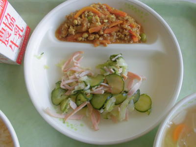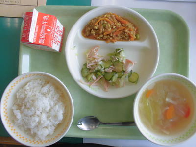 2020年8月21日 14時08分今日の給食は、夏にぴったりのドライカレーです。あまり辛くはありませんが、豚挽肉や細かく砕いた大豆、人参がたっぷり入っていておいしかったです。ハムサラダもきゅうりたっぷりハムたっぷりで、さっぱりな味付けがいいですね。そして野菜スープもいいですね。とにかく給食は野菜の宝庫です。昨今、野菜の価格が高騰していますので、生徒の皆さん、給食で野菜を補充しましょう。そして暑い日に欠かせないのが冷たい牛乳です。これを飲むとすっきり爽やか・・・・生き返る~。ごちそうさまでした。