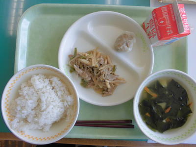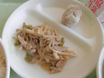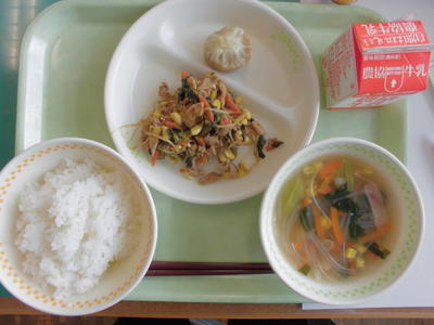 2020年8月26日 17時59分今日の給食は、なんと言ってもチンジャオロースです。これは絶品でした。たけのこの歯ごたえとたっぷり豚肉、ほどよいとろみの餡がたまりません。今日はおかわりしちゃいました。うまい!!そして、ポークシューマイ。これもうまい。ビッグサイズで最高でした。豆腐スープは、これでもかというほどたっぷりのホウレン草にその中にゴソッとかくれていた豆腐、栄養満点最高でした。明日の給食は・・・オーマイガー、明日は弁当でした。残念。