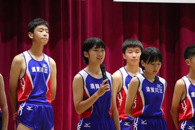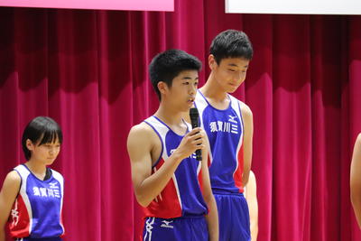 2020年8月26日 17時49分支部駅伝大会の選手壮行会を行いました。全校生が気合いの入った応援を行いました。応援団も素晴らしい応援でした。でも、時短バージョンだったのが少し残念でしたが、今のご時世仕方ありません。キャプテンの牧野君からは自信に満ちあふれたお礼の言葉が述べられました。暑い中、朝早くから頑張ってきた練習の成果が十分に発揮できることを祈っています。三中 頑張れー!!!!!!!!!!!!!