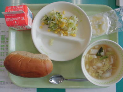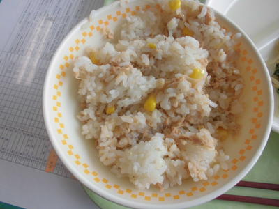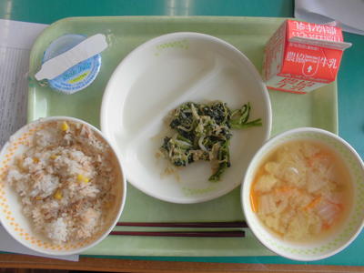 2020年7月24日 09時33分遅くなりましたが、金曜日の給食です。目玉は、ツナご飯です。ツナ大好きな人には最高の一品ですね。コーンが彩りとアクセントになっていて良かったです。味ご飯系は、我がクラスは完食です。みちのく汁は、定番の味噌汁って感じでしょうか。野菜たっぷりの味噌汁です。ほうれん草のごま和えは、ごまの風味たっぷりで、さっぱりしていました。デザートはソーダゼリーです。ちょっぴり凍っています。これが心と体を癒やしてくれますね。生き返る~。ごちそうさまでした。