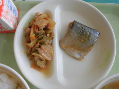 昨日の献立です。「きうり天王祭献立」と題して、目玉メニューは、きゅうりと豚肉のピリ辛炒めです。豚キムチのような感じで、うま辛でした。ご飯にピッタリです。ご飯にピッタリと言えば、本日のメイン、さばの味噌煮です。これは最高です。うますぎる!!!!そして、さわに椀。沢煮と書くそうで、たくさん煮たと言う意味だそうです。ごらんお通りの具だくさんです。おいしかったです。ごちそうさまでした。