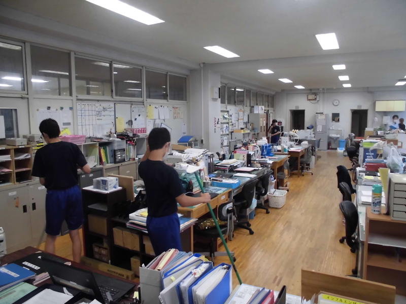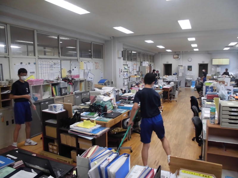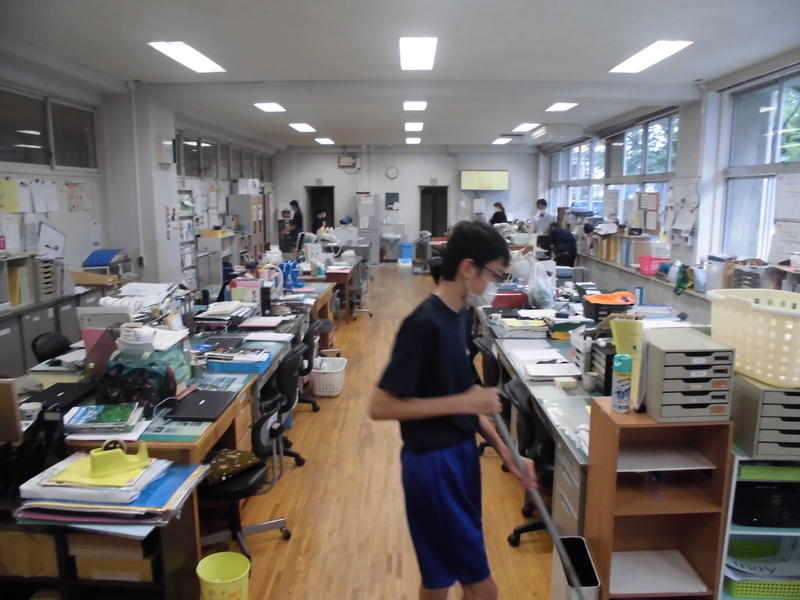 職員室の清掃の風景です。職員室清掃のメンバーが新しくなりましたが、これまでと同様に無言清掃で取り組んでいます。さすが3年生です。職員室は3年2組が担当ですが、前回のメンバーも今回のメンバーも一生懸命に取り組んでいます。これからも全校で無言清掃に取り組んで行きましょう!