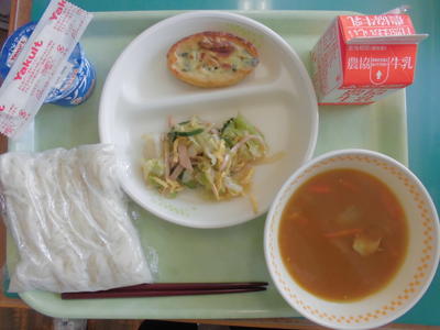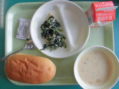 2020年6月4日 13時47分本日の給食は、うれしいパン食です。レーズンクリームをつけて食べてよし、コーンポタージュに浸してたべてよし、極めつけは、鶏ささみとほうれん草の和え物を挟んで食べてよし。いろんな食べ方がありますね。私は、王道でいきました。おいしかったです。ごちそうさまでした。
