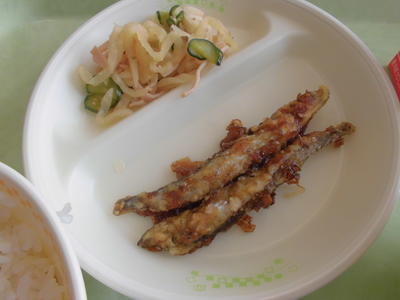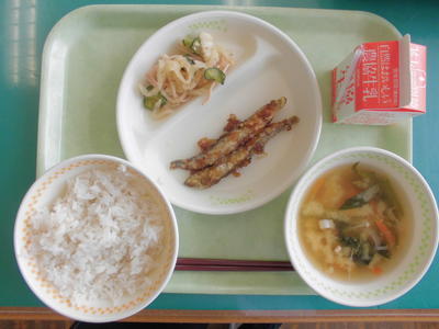 2020年6月3日 14時12分今日の給食は、ししゃもの南蛮漬けです。酸味が効いたさっぱりした餡がいいですね。しかも子持ちです。おいしかったです。カミカミ和えは、野菜とイカの相性がいいですね。これもさっぱりしていました。えのきの味噌汁は、何も言うことがありません。えのき最高です。今日は、「歯の衛生週間」ということで、カミカミできる健康給食でした。ごちそうさまでした。