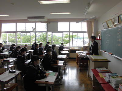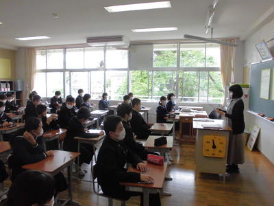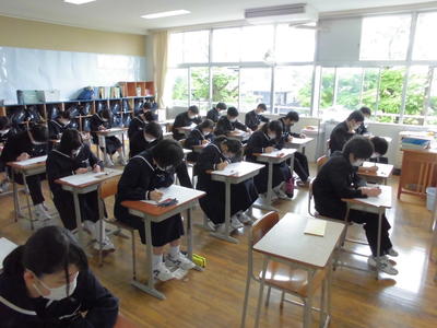 やっと日常的な学校の風景になってきました。元気なあいさつは控えて、物静かな登校でしたが、無事一日のスタートをきることができました。当然、窓を開けて換気を良くしたり、できるだけ机の間隔を空けてといった、対策をとりながらの生活です。全体的には、落ち着いているように感じました。さて、今日の授業は、学級活動がメインのようでした。特に1年生は、何かと決めることやわからないこともたくさんあって大変ですね。3年生は、なんといきなりのテスト!。さすが三中ですね。