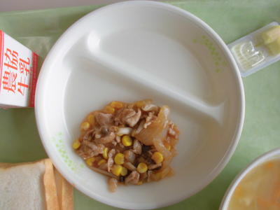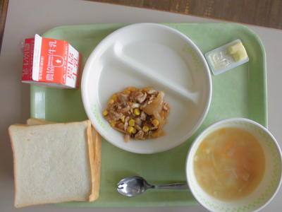 今日の給食は、「食パン、牛乳、豚肉のケチャップ炒め、マカロニスープ、はちみつ&マーガリン」です。今日は、2通りの食べ方で食パンを食べました。まずは、はちみつ&マーガリンをサンドしてガブリ!はちみつとマーガリンの相性は最高ですね。はちみつの甘さは何とも言えません。マーガリンは甘い物との相性抜群ですよね。次にケチャップ炒めをサンドしてガブリ!これもまた最高です。ケチャップの甘酸っぱさと豚こまの風味、コーンの甘みのコラボが絶妙です。パンにもピッタリ!マカロニスープは、マカロニたっぷり、プリプリです。ホロホロになったじゃがいもがこれまたいいですね。とてもおいしかったです。ごちそうさまでした。