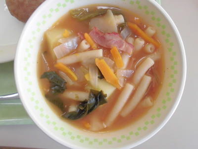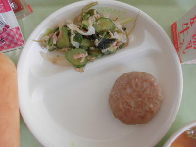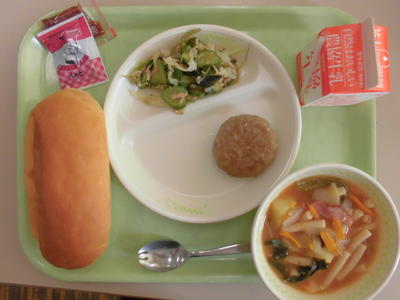 パンを半分にして、海藻サラダを挟んでパクリ、残り半分にハンバーグを挟んでパクリ、うまい!ハンバーグは、まさにハンバーガーですね。お肉も軟らかくて最高でした。ミネストローネもマカロニたっぷりで、トマトの酸味もほどよくておいしかったです。さっぱりしました。チョコ大豆は、チョコに飢えている子どもたちにチョコッとプレゼント。ごちそうさまでした!