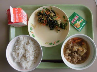 2019年7月10日 15時17分本日のメニューは、「麦ご飯、牛乳、肉じゃが、切り干し大根のごま和え、ふりかけ」です。肉じゃがは肉たっぷり、じゃがいもたっぷりで、軟らかくておいしかったです。ご飯をかけたくなるおいしさです。切り干し大根のごま和えは、野菜たっぷりで、ごまの風味が食欲をそそります。のりたまのふりかけも懐かしいい味でいいですね。ごちそうさまでした。