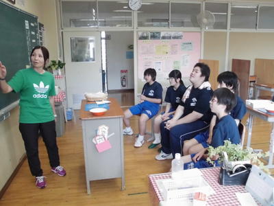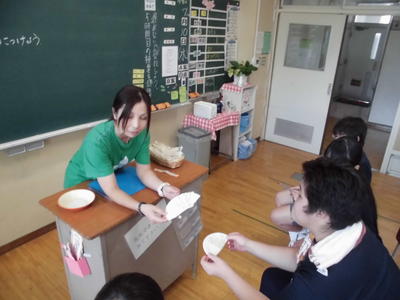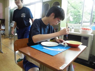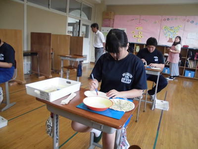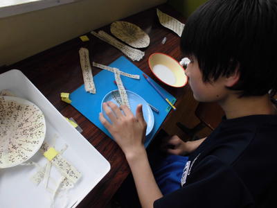 2019年7月10日 17時09分ぼたん学級の授業です。「いっかん張り」を行いました。良い張り方や悪い張り方を確認し、実際に練習用の更に和紙を貼り付けました。今日は練習でしたが、本製作が楽しみですね。おっと、一人だけ本製作をしている人がいました。作業が早いですね。