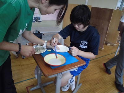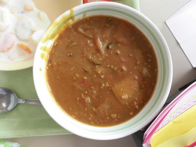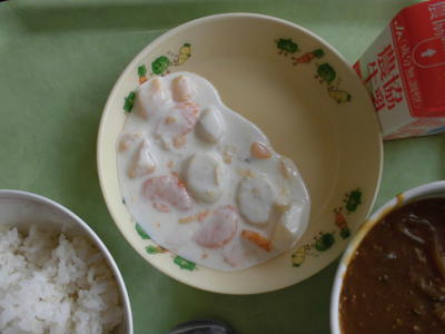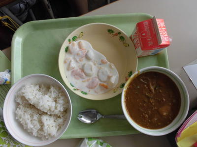今日のメニューは、「キューカンバーカレー、牛乳、麦ご飯、ヨーグルト和え」です。ヨーグルト和えは、今日のムシムシさを爽やかにしてくれます。フルーツとヨーグルトの相性も抜群、子どもたちに大人気です。