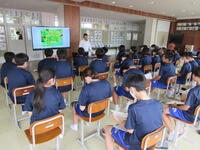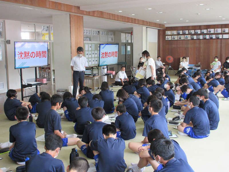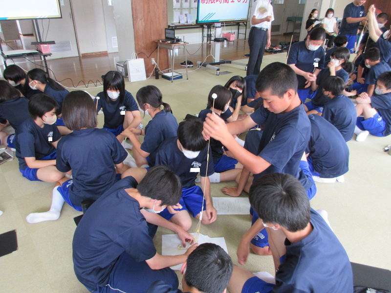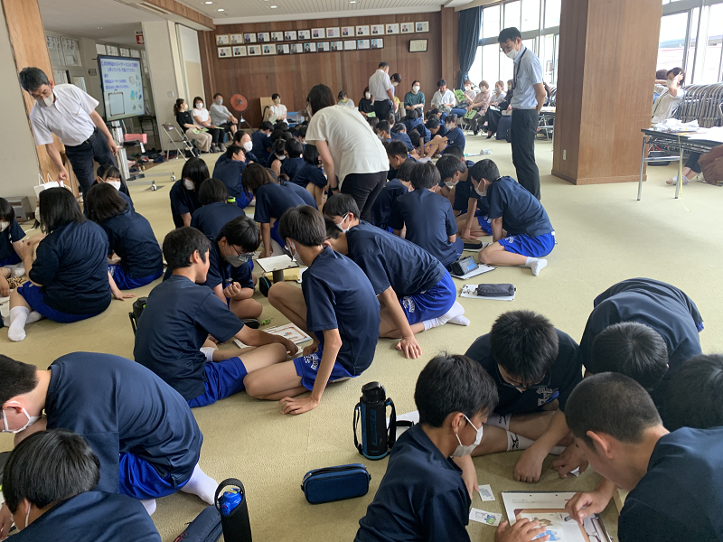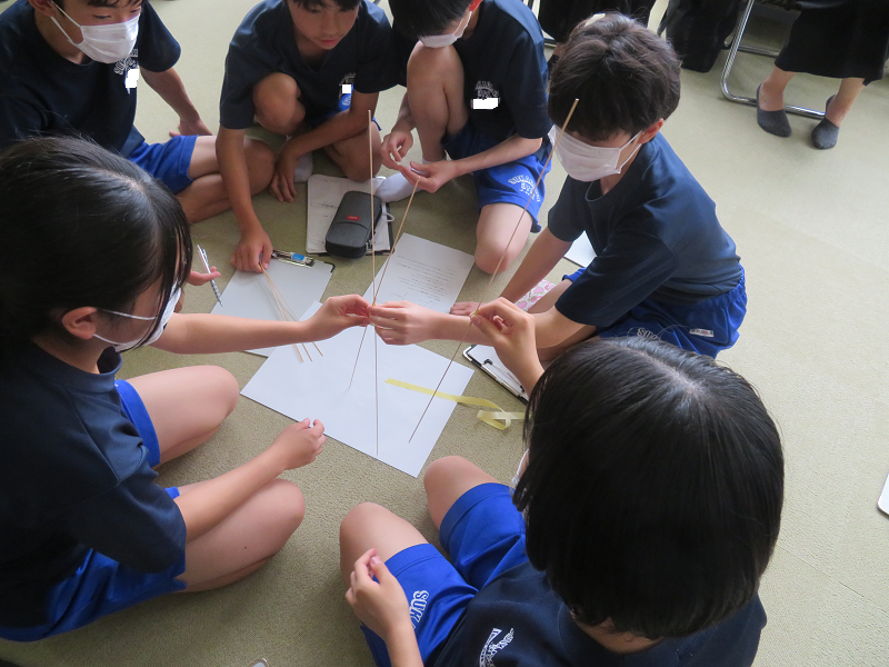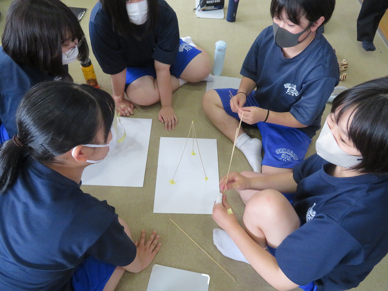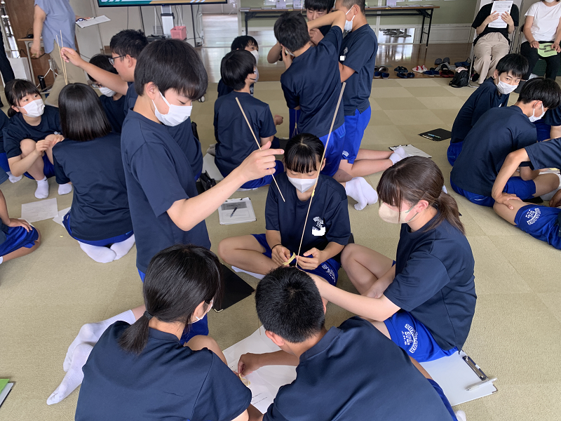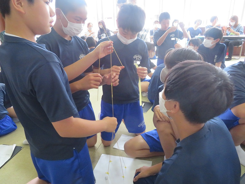 2年生76名は、5校時目の授業参観で、教頭先生による学年授業を実施しました。防災コミュニケーションワークショップと題して、防災意識を高めたり、コミュニケーション能力を養ったりする体験活動を行いました。グループに分かれて、「竹ひごタワー」と「災害時シミュレーション」を行いましたが、それぞれが気づいたことや意見を出し合ったことで、活動が活発になりました。仲間と協力することや事前の準備の大切さなどを学ぶ機会になりました。