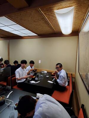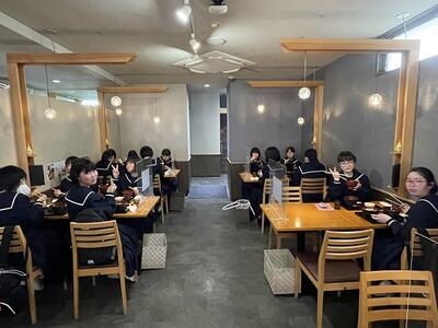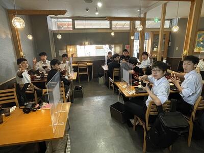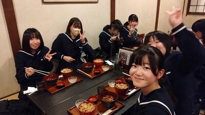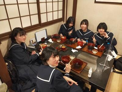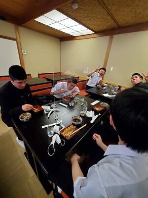 2023年4月19日 13時10分修学旅行団は、無事鎌倉に到着し、お昼を食べています。峰本と川古江屋では、天丼や豚丼を食べ、エネルギーを充填中です。