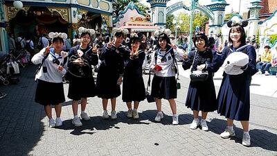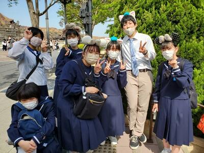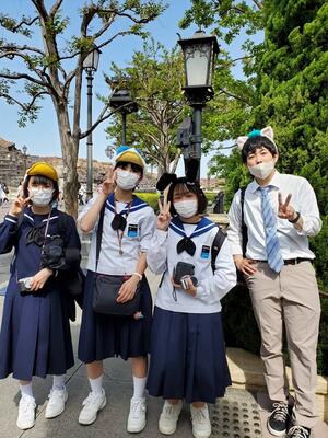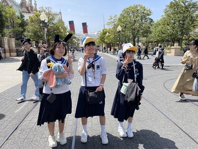 2023年4月21日 11時54分現在修学旅行生は、ディズニーシーの中で楽しんでいます。一度中に入るとなかなか生徒たちに遭えませんが、出会えた生徒を見ると、被り物で楽しんでいるようです。