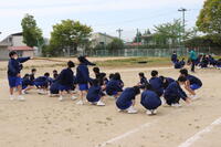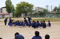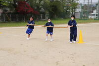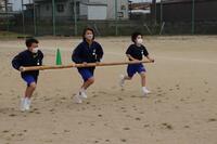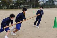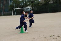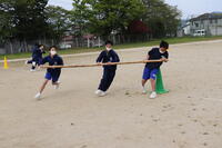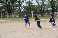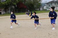2023年4月24日 16時32分本日は1年生で校内体育祭の練習を行いました。体育の授業で何種目か練習していますが、今日の練習は「台風の目」です。3人1組になって長い竹の棒をもってぐるぐる回りながらゴールを目指します。みんな笑顔で練習に励んでいました。