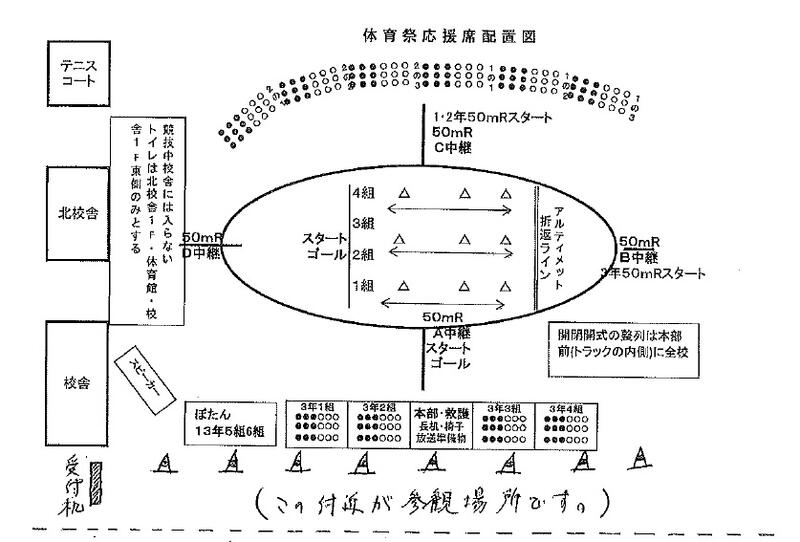 2023年5月10日 19時19分明日は校内体育祭です。天気予報では朝から晴れの模様です。熱中症対策のために帽子とタオル、飲料水を多めに用意してください。明日は保護者の観覧が可能になります。下の図を参考にして子どもたちの活躍をご覧ください。