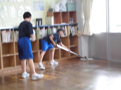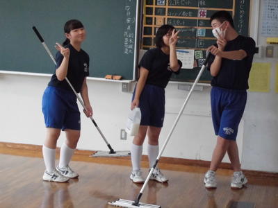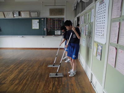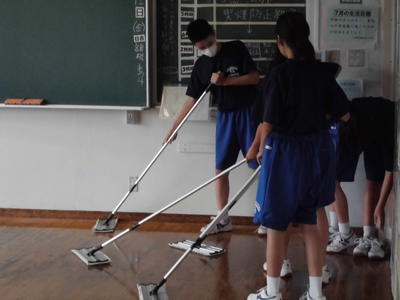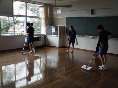 2019年7月12日 18時00分学期1回のワックス清掃です。整美委員会が中心となって、各クラスや特別教室をピカピカに仕上げました。しかも2度塗りです。さすがです。お疲れ様でした!