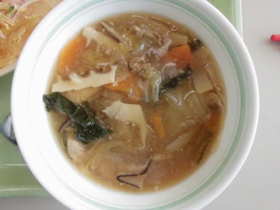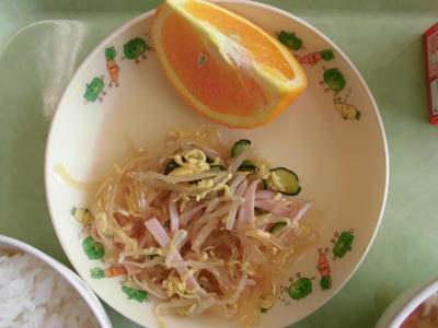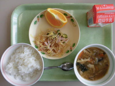 メニューは、「中華丼、牛乳、バンサンスー、オレンジ」です。バンサンスーは、とにかくさっぱりしていて、今日みたいな暑い日には最高ですね。酢の酸味がたまりません。そしてデザートのオレンジが口の中を爽やかに。甘くておいしかったです。ごちそうさまでした。