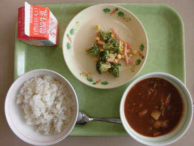 今日のメニューは、「麦ご飯、牛乳、ポークハヤシ、県産ブロッコリーのサラダ」です。ブロッコリーのサラダは、鮮度抜群のブロッコリーに、マヨネーズベースのごま風味ドレッシングがなんとも言えないおいしさです。これだけでもご飯が進みます。ポークハヤシにブロッコリーサラダ、学校なのでおかわりはできませんが、晩ご飯だったら2~3杯おかわりしちゃいそうです。ごちそうさまでした。