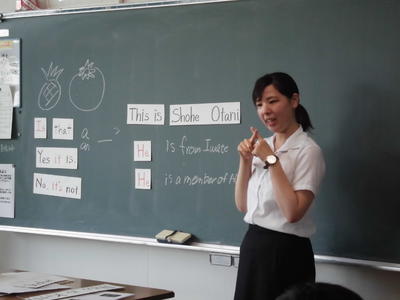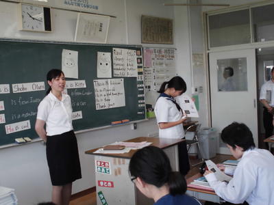 2019年6月5日 10時00分教育実習生の菅野さくら先生が研究授業を行いました。人物を紹介する英文をつくって、友だちに発表する授業です。とてもわかりやすい授業で、菅野先生も楽しそうに授業をしていました。子どもたちが上手に発表すると、「グッジョブ!」と優しく褒めていました。いいですね~。