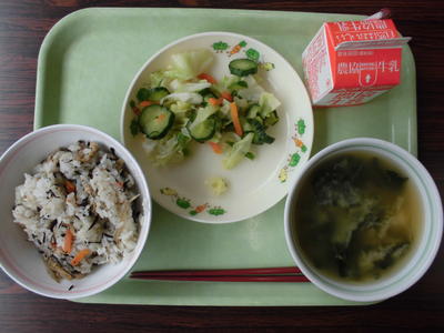 メニューは、「五目ご飯、牛乳、キャベツの浅漬け、豆腐とジャガイモの味噌汁」。キャベツの浅漬けは、パリパリな歯ごたえで、さっぱりしていておいしかったです。味噌汁も定番具材で、完璧です。本日もおいしくいただきました。