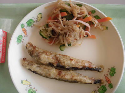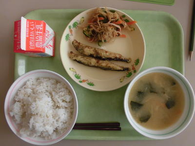 本日のメニューは、「麦ご飯、ししゃもの南蛮漬け、牛乳、カミカミ和え、えのきの味噌汁」です。カミカミ和えも具だくさんで、歯ごたえがいいですね。ご飯のおかずとしてもピッタリです。そしてえのきの味噌汁。個人的に私の大好物。えのきの歯ごたえがたまりません。時々歯にひっかかるのが難点ですが・・・。でもおいしい。ごちそうさまでした。