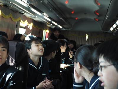 2019年5月23日 08時40分バスの中では、各班が練りに練ったレクレーションで盛り上がってます。テンション高すぎ!1号車はクイズ、2号車はカラオケで賑やかさ満載!