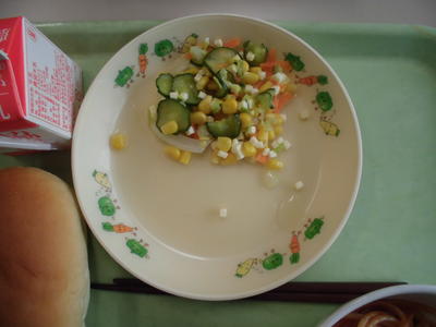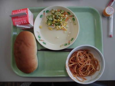 メニューは、「減量コッペパン、牛乳、スパゲティナポリタン、チーズサラダ」です。パンは、いつも柔らかくておいしいです。チーズサラダは、チーズのつぶつぶがいいですね。時間が合ったら、箸で一粒一粒つまんで味わいたいです。ごちそうさまでした。
