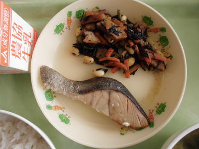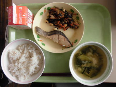メニューは、「麦ご飯、牛乳、鮭の塩焼き、ひじきの炒り煮、小松菜と豆腐の味噌汁」です。ひじきの炒り煮は、豆たっぷりで、ご覧の通りの健康食品ですね。おいしかったです。味噌汁もおいしかったです。和食はいいですね。ごちそうさまでした。