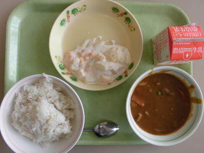 メニューは、「麦ご飯、牛乳、チキンカレー、ヨーグルト和え」です。チキンカレーは、もう何も言うことはありません。おいしいの一言です。ご飯が進みますね。子どもたちもがつがつ食べていました。カレーは、国民的人気メニューですね。ごちそうさまでした。
